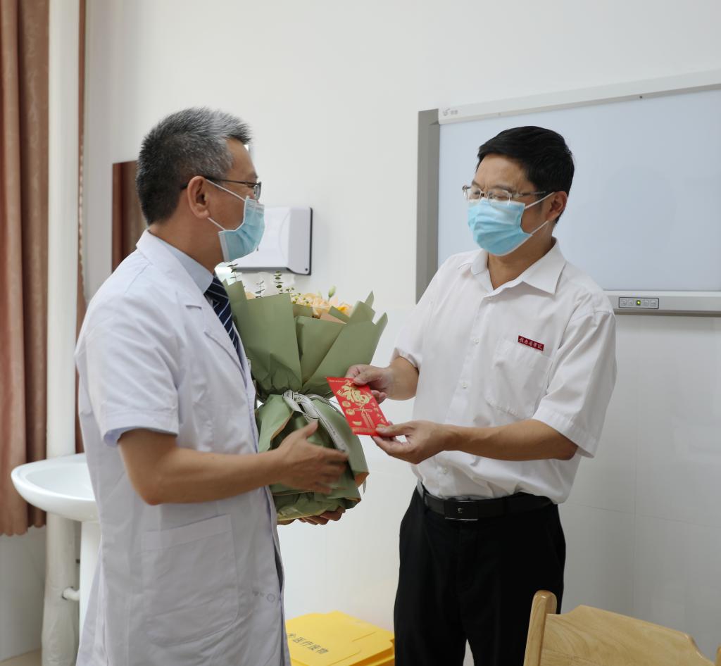 8月19日,在第四个中国医师节来临之际,学校党委书记李恭进,党委副书记、校长张小康,党委副书记曾泽鑫分别到三附院、一附院、二附院走访慰问,向全体医师致以节日的问候,为医师代表送上慰问金和鲜花。学校党委委员、组织部长甘雅芬,党委委员、宣传部长廖志平陪同走访慰问。