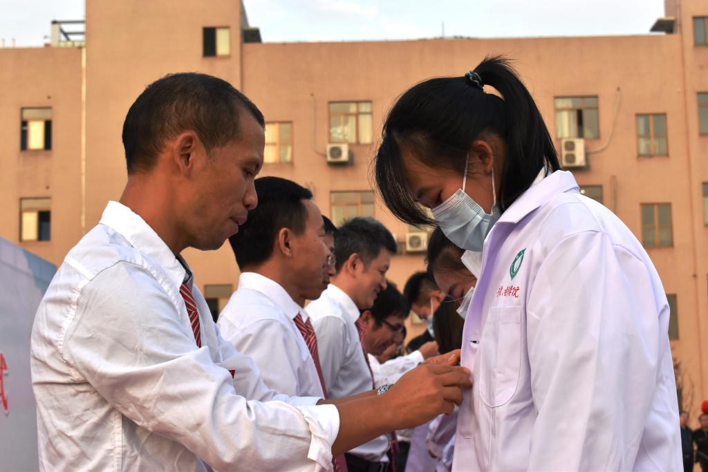 仪式在雄壮的国歌声中拉开序幕,各教研室的主任、优秀教师代表打开并为同学们穿上象征纯洁而神圣的白袍,并整理衣扣,同学们向嘉宾鞠躬致谢,意味着接过守护生命的接力棒,意味着坚守对生命的敬畏和信仰。