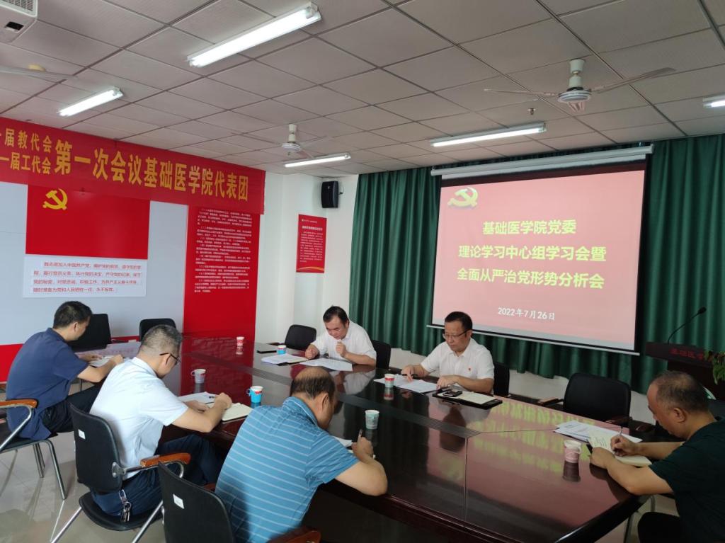 7月26日上午,基础医学院党委理论学习中心组学习会暨全面从严治党形势分析会在黄金校区召开。基础医学院党政领导班子成员,学院办公室、支部书记代表参加会议。第一附属医院(第一临床医学院)党委副书记徐小军到会指导。