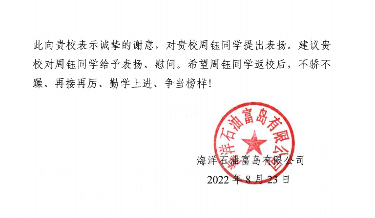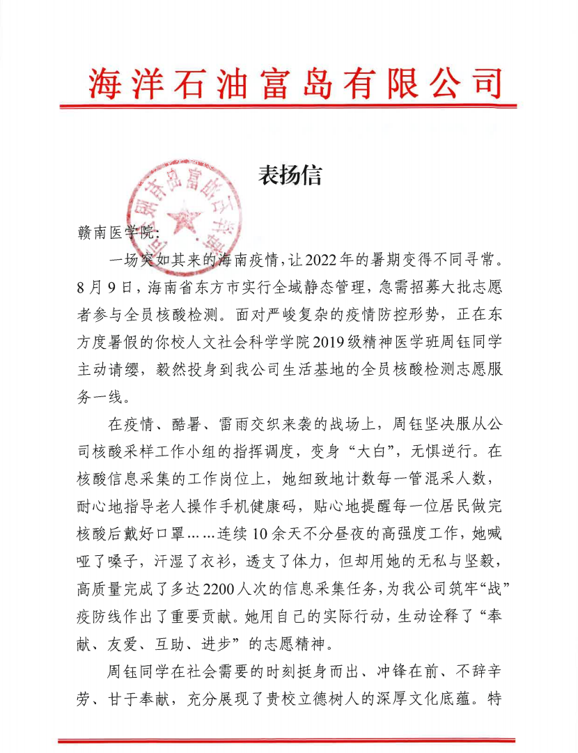 近日,学校收到了一封来自海南省东方市海洋石油富岛有限公司的表扬信。信中高度赞扬了我校人文社科学院2019级精神医学班周钰同学面对严峻复杂的疫情防控形势,主动请缨,毅然投身到该公司的全员核酸检测志愿服务一线,为公司筑牢抗疫防线作出了贡献。