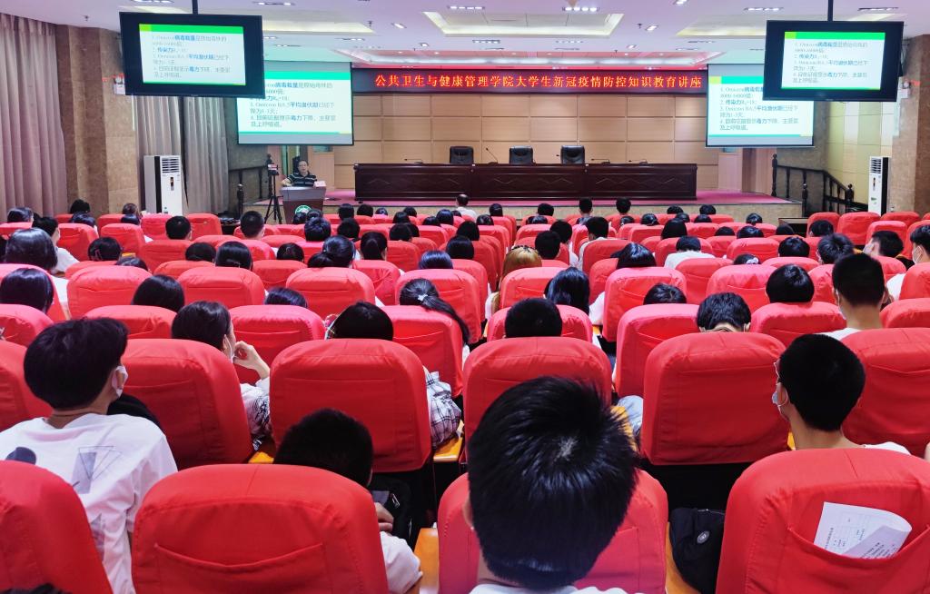 9月5日晚上,公共卫生与健康管理学院在黄金校区举行新冠疫情防控讲座,该院党委副书记邱伟及2022级全体新生通过线上线下方式参与。