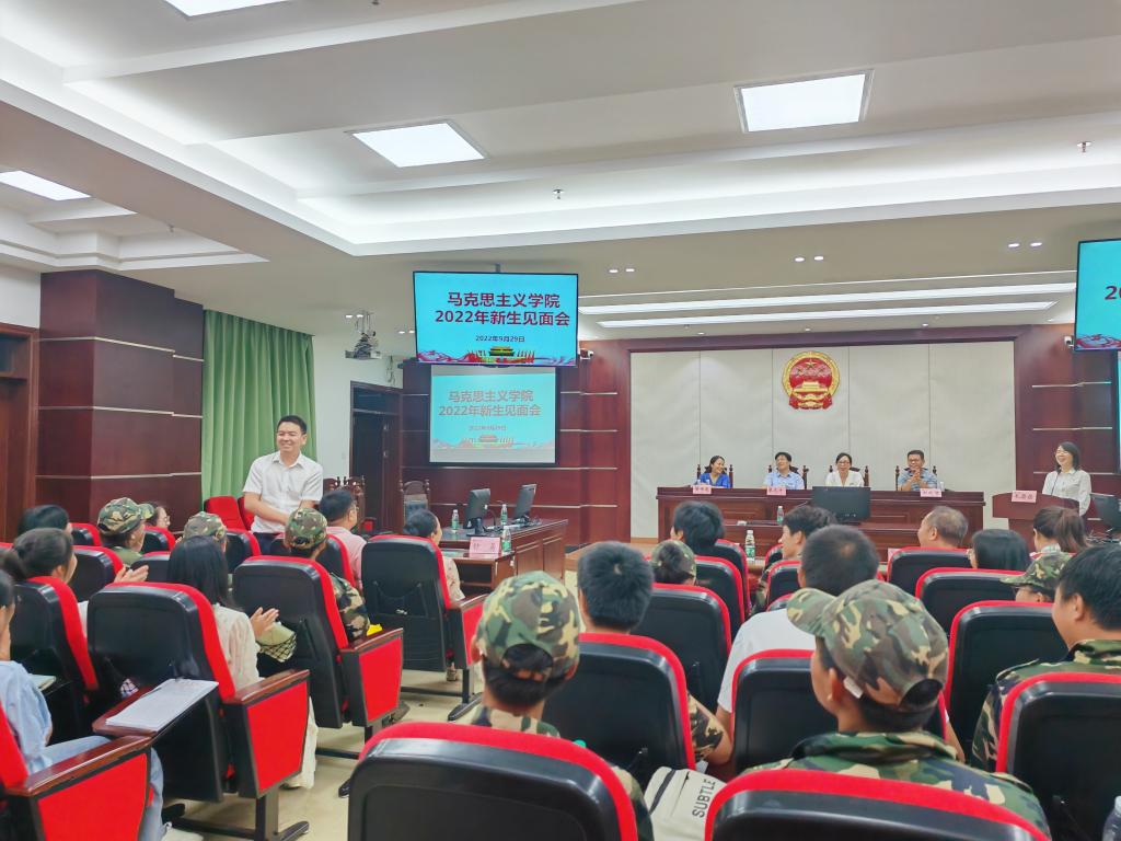 9月29日,马克思主义学院在第二教学楼模拟法庭召开2022级新生见面会。学校党委委员、学院院长廖志平,学院党委书记连璐,学院党委委员、副院长曾芳莲,学院党委副书记毛磊焱,法学专业教师、学工办导员、2022级新生班主任及全体新生参加会议。