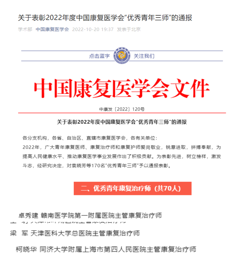 近日,中国康复医学会公布了2022年度中国康复医学会“优秀青年三师”的表彰名单。该院2006级运动人体专业梁军等多名校友被评为优秀青年康复治疗师。据悉,此次优秀青年治疗师评选是在全国范围内进行推选,名额仅有70个。