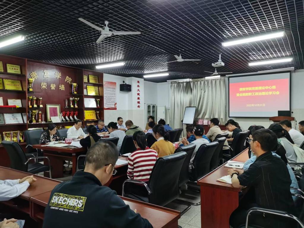 10月31日,康复学院召开党委理论学习中心组暨全院教职工政治理论学习会,专题学习党的二十大精神。学院全体教职工参加,第一附属医院党委理论学习中心组代表列席旁听。