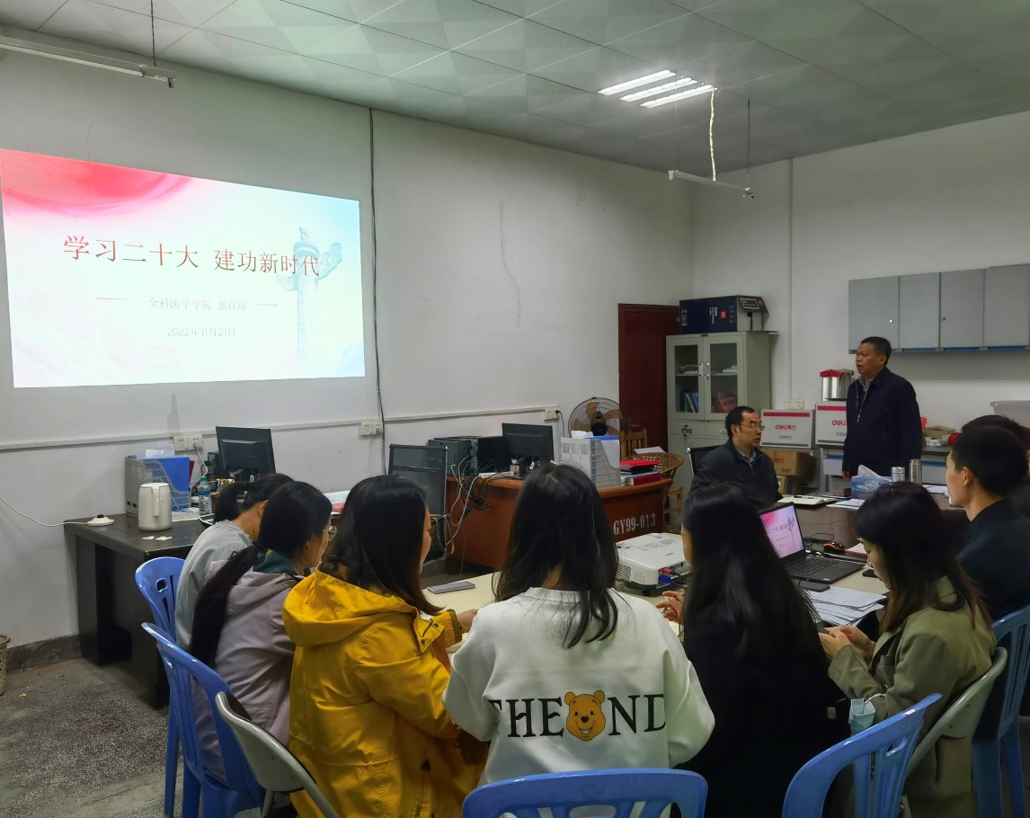 11月21日,全科医学学院党委书记张自翔给学院全体教师宣讲党的二十大精神。他强调,学习好、宣传好、贯彻好党的二十大精神,是当前和今后一个时期的首要政治任务,要深刻领悟“两个确立”的决定性意义,增强“四个意识”、坚定“四个自信”、做到“两个维护”,落实“五个牢牢把握”的重要要求,在全面学习、全面把握、全面落实上下功夫,一步一个脚印把党的二十大作出的重大决策部署付诸行动、见之于成效。