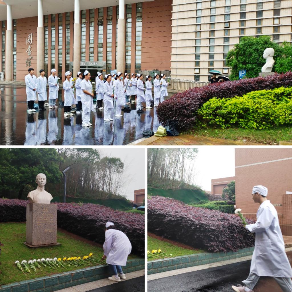 随后,学生代表依次为熊慬校长敬献鲜花并默哀,并在熊慬校长雕塑前集体诵读南丁格尔誓词。
