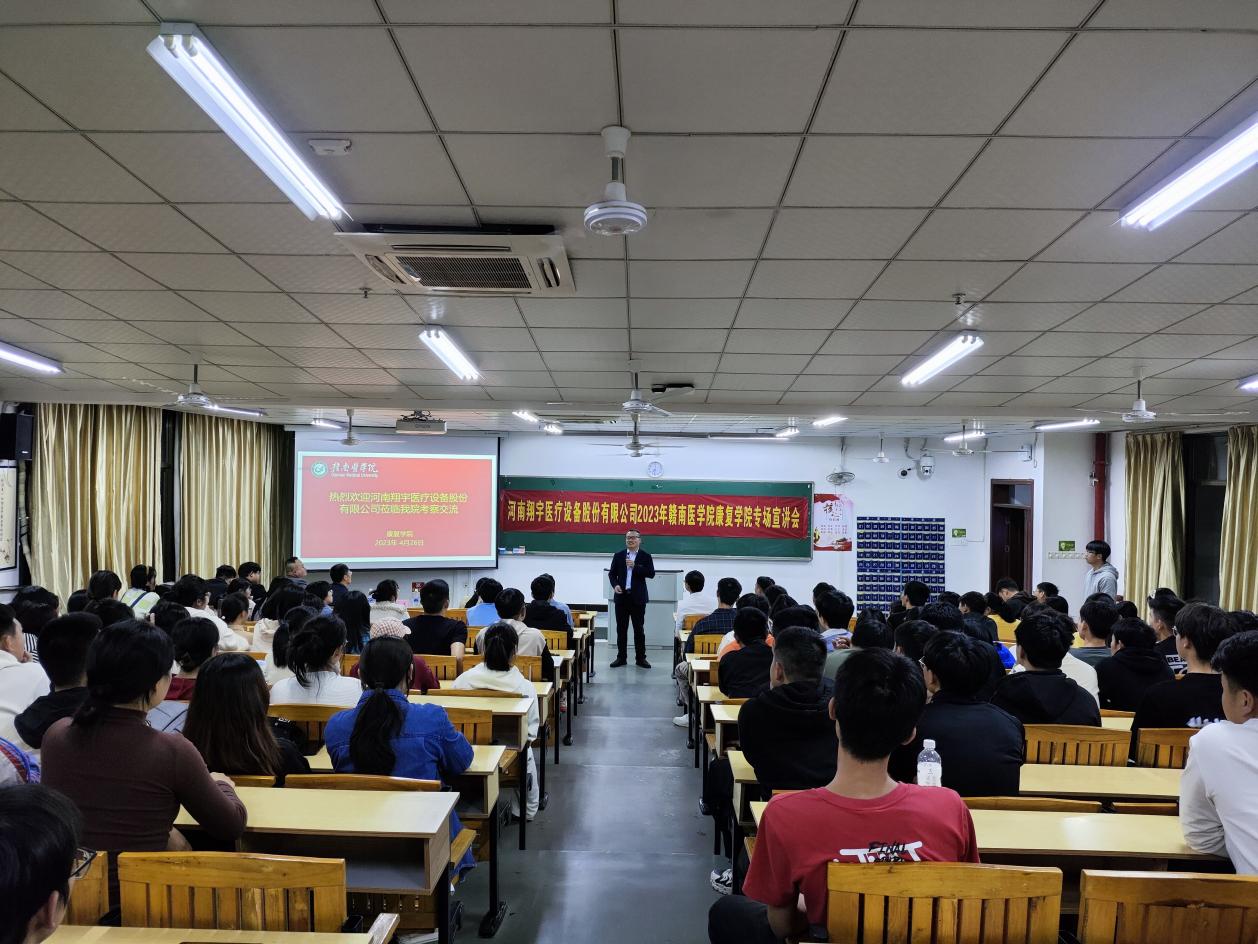 4月26日晚,河南翔宇医疗设备股份有限公司江西省区经理张磊,翔宇医疗HR王轩一行,应邀到康复学院考察交流,并在黄金校区召开了专场宣讲会。康复学院院长温优良出席,部分教师代表以及在校本科生代表240余人参加。