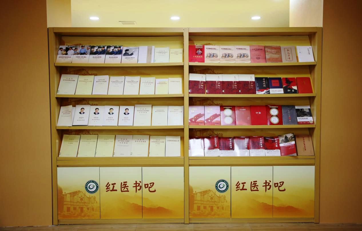 红医书吧位于该院黄金院区门诊大楼二楼,占地面积120余平方米,整体布局分“红医长廊”“红医书屋”“红医茶吧”三大空间板块,凸显党建引领、红医精神、抗疫先锋、白鹭文化、先锋人物等元素,配备有习近平新时代中国特色社会主义思想书刊专门书柜、红色书刊专门书柜,标准化党建活动室、新时代文明实践站等活动区域。