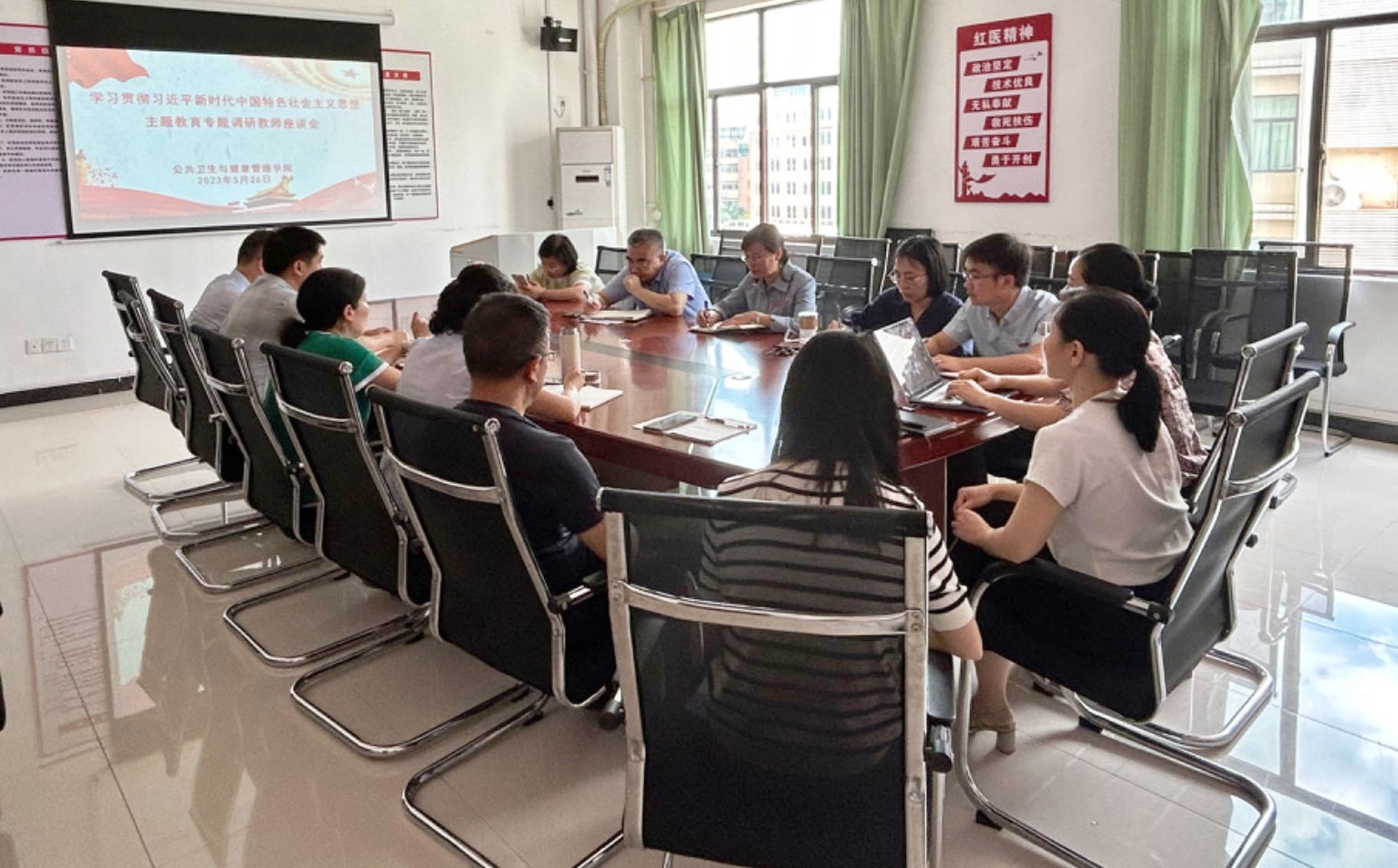 5月26日上午,公共卫生与健康管理学院召开学习贯彻习近平新时代中国特色社会主义思想主题教育专题调研教师座谈会,该院领导、各科室教师代表参会。