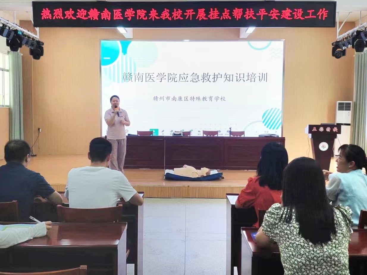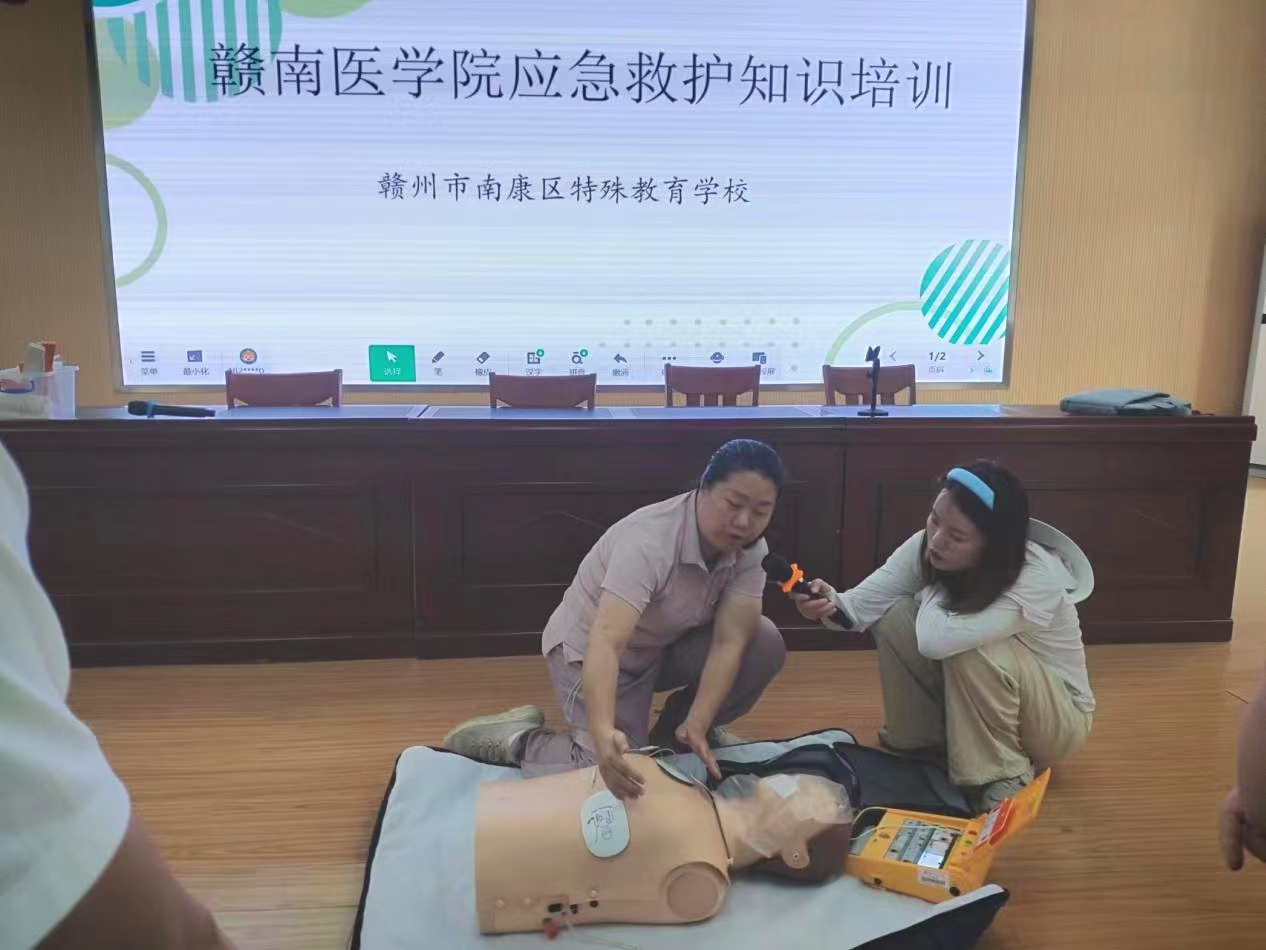全科医学院社区医学教研室主任张琼为特殊教育学校教师进行“逃生避险”知识的普及宣传、实践培训,包括:心肺复苏、体外自动除颤仪的使用、创伤救护基本技能(止血、包扎、骨折固定及安全搬运)、煤气中毒的现场处理,海姆立克急救法口诀石头剪刀布的具体应用方法,提高了教师的自救防护能力。