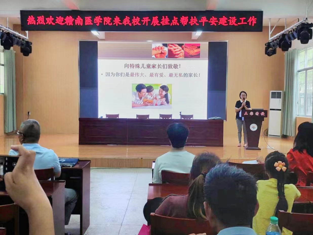 康复学院康复治疗教研室古月明老师利用视频和PPT对特殊教育学校教师和学生家长进行心理疏导和心理健康教育,她重点讲授了唐氏综合症、自闭症、克汀病的生理特性、智能发育的障碍和多发畸形病人的患病概率以及甲状腺异常引起的症状,告诉老师和家长有些病症如果及时治疗和诊断,近90%患儿智力可达到正常等。