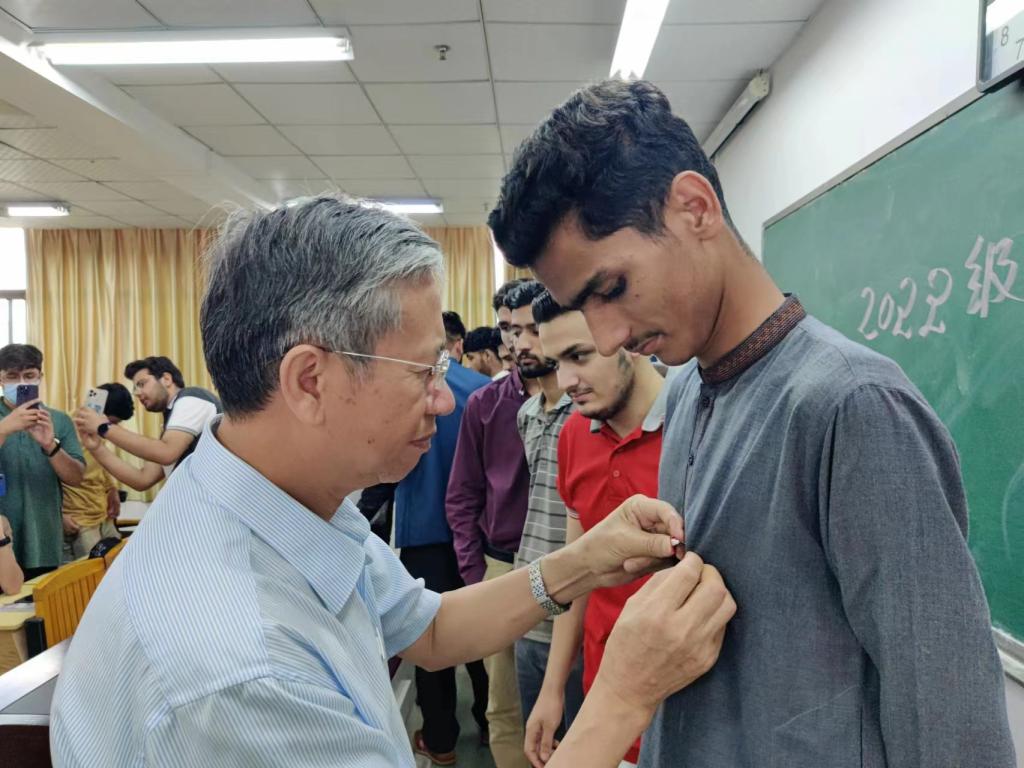 留学生还为全体老师献上了极具巴基斯坦民族特色的帽子Chatrali Pakol,国际教育学院为每名留学生佩戴上了赣南医学院校徽。
