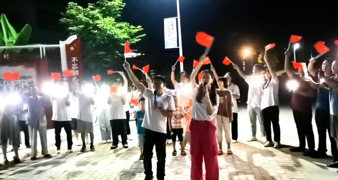 7月14日中午,实践团成员在指导老师的带领下齐聚丹溪村,前往肖华和彭绍辉等上将居住地旧址,调研学习红军医院旧址,聆听《肖华上将在丹溪》《丹溪老人送“丁”》等红色故事,瞻仰革命烈士,感受革命先辈们艰苦奋斗、英勇斗争的革命精神。夜幕降临,在丹溪村红军文化广场,队员们合唱《我和我的祖国》《十送红军》等红色曲目,歌声吸引了周边的村民和小朋友自发加入队员们合唱《国家》。大家挥动着五星红旗,打开手机的闪光灯,甜美的歌曲久久回荡在大家心中。实践团成员与当地村民同唱红歌,唤醒人们的家国情怀。