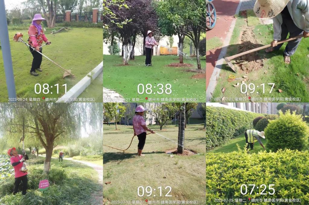 后勤绿化保洁中心人员在高温干旱期间,战高温、冒酷暑,积极做好绿植、草坪的高温抗旱、养护修剪、杀菌防虫、杂草清理及施肥工作,确保绿化景观苗木安全度夏;大风雷暴天气,加强巡查校园路面积水、树木断枝倒伏情况,第一时间排除安全隐患,做好排水疏通、树木加固、苗木补种工作,努力打造绿色后勤,建设美丽校园。