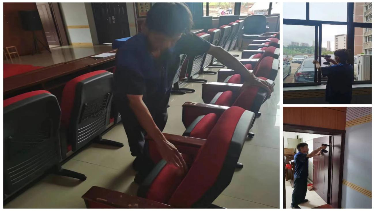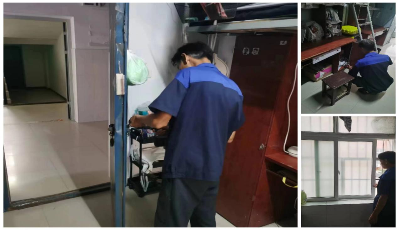 暑期是校园基础设施维修改造升级的关键时期,在后勤保障中心领导的运筹和推动下,后勤专项项目有序推进。为提升师生学习生活环境,后勤维修中心完成了心理素质拓展基地建设工程、康复学院运动场修复工程、西门污水井改建工程、宿舍楼顶安装晾衣架工程、第一食堂建筑外立面改造工程等10余项重点项目。为满足今年新生入学后学习和生活的需要,后勤维修中心对教室、宿舍进行全面排查,对桌椅、床铺、门窗进行了全面的修缮。对1-6栋学生宿舍墙面零星修补粉刷共计1137个房间、改换门锁771套、拆卸搬运学生宿舍4548套旧家具等。为确保新学期开学各项基础设施的安全运行,设备正常使用,后勤维修中心清掏全校32座化粪池、同时对公共建筑、路面等区域破损部分进行了及时的修缮,完成了上千项零星维修项目。为确保各项工程优质高效推进,各项维修抢修高效完成,他们连续作战整个暑假,严格遵循值班值守制度,加班加点,随时待命,问题不解决,工作不停歇。