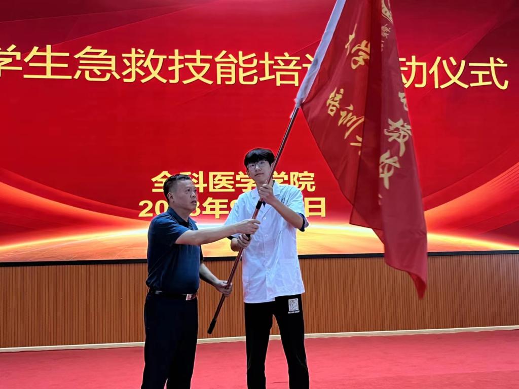 最后,罗晓婷宣布大学生急救技能培训正式启动,由张自翔向教官代表授旗。