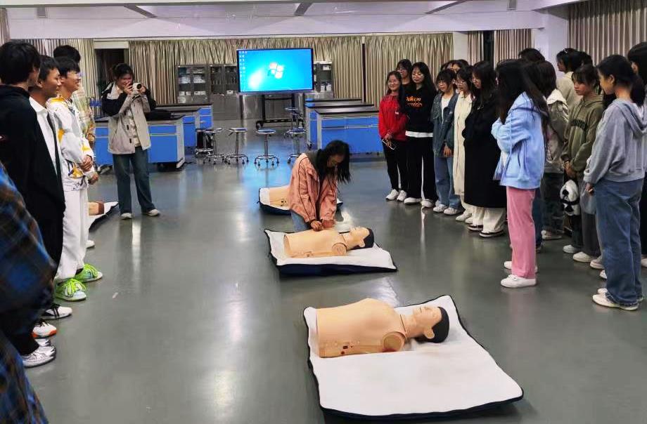 “防溺水”应急安全演练过程中,该院组织各班级分班演练,并邀请校急救协会成员演示对溺水人员上岸后的急救处理方法,指导学生如何脱困、自救、互救,如采取抛投漂浮物、呼喊成年人、拨打报警电话等措施。