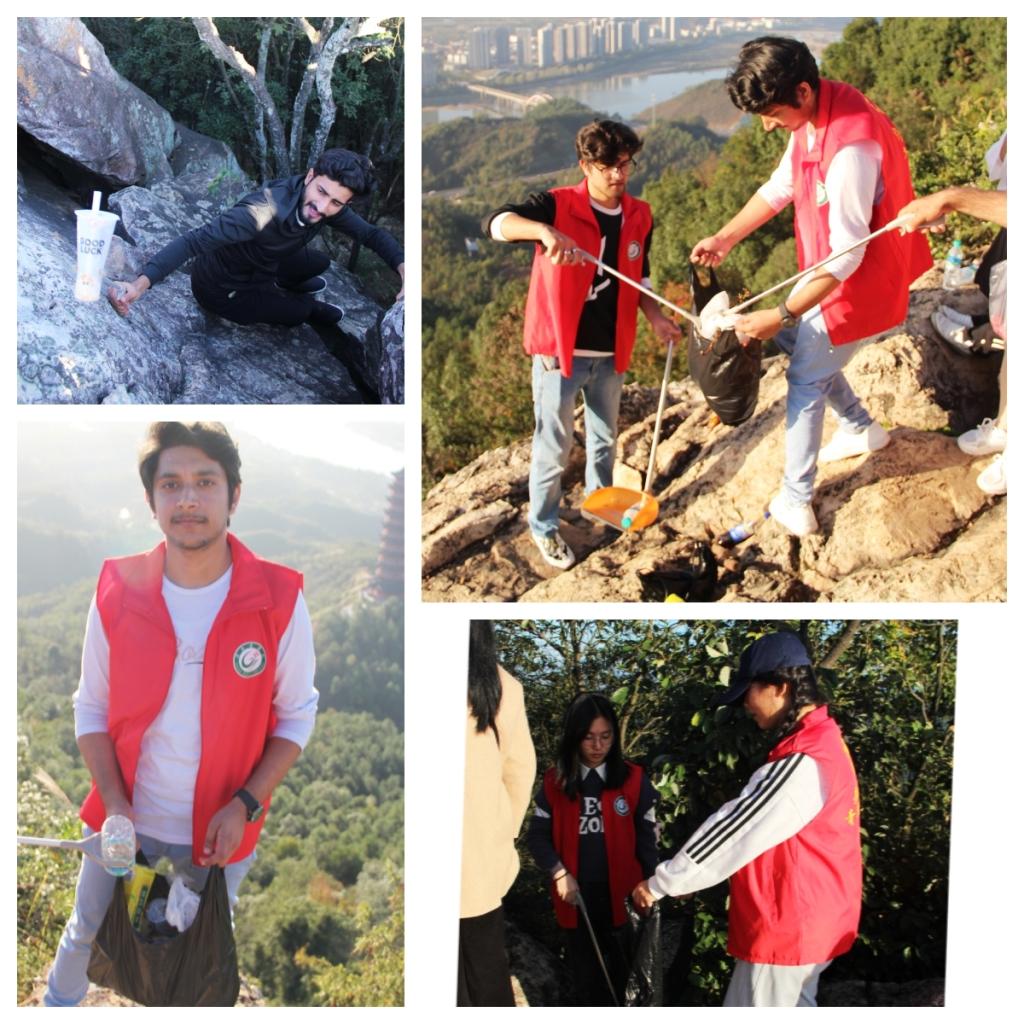 中外留学生穿着赣南医学院青年志愿者制服,从山脚往山顶攀登,捡拾着一路上可见的垃圾,到了山顶后,游客们在此处等待观赏日落美景,赣医中外学子拿着垃圾夹捡拾垃圾却显得尤为特别。当我们展示出“中外学生齐上阵,森林环保你我他”的宣传标语时,不少游客受到感染,也加入清理垃圾的队伍,一起将山顶上的垃圾进行了清洁。许多游客纷纷给予赞许,表示“赣南医学院的活动做得很有意义。”