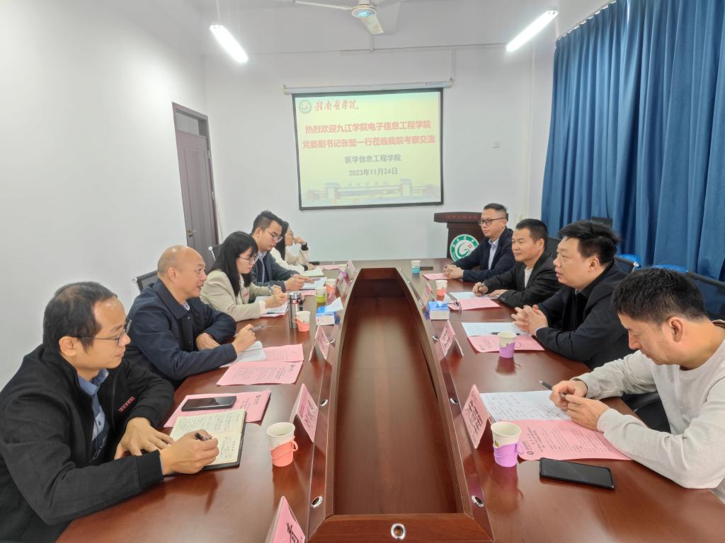 11月24日上午,九江学院电子信息工程学院党委副书记张堑一行3人来访。医学信息工程学院党委书记唐明接待了张堑一行,并在黄金校区医工大楼西楼会议室举行了座谈交流。