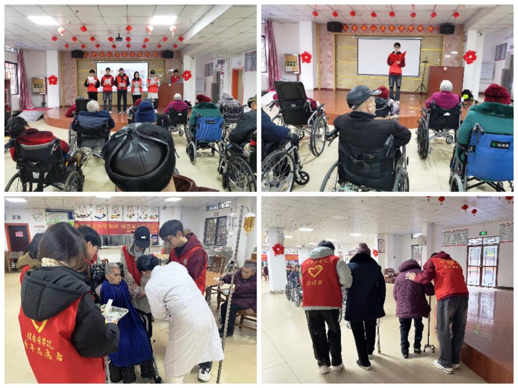 活动伊始,养老院工作人员对志愿者进行了专业培训,包括礼貌用语、基本护理知识以及紧急情况的应对技巧等。随后,志愿者开始了与老人的深入交流,他们耐心地陪伴老人聊天,分享生活中的点滴乐趣和科普健康知识。接着,师生共同带来文艺表演,他们激情朗诵了《以时代之眼,我们这样看中国》、讲述了“红色华佗”开国中将傅连暲的故事等。