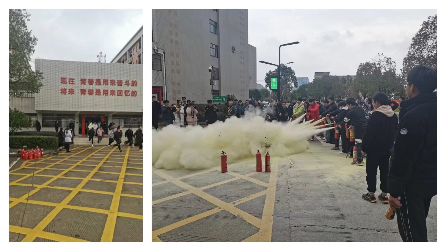 逃生演练结束后,在学生宿舍第3、4栋前小广场还组织了一场灭火器的使用与实操演练,传授了如何使用灭火器的技巧,让每一位参与者亲自体验了灭火器的使用方法,做到人人都会使用灭火器。