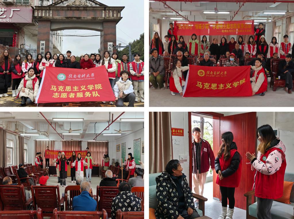 3月9日在学院党委副书记毛磊焱的带领下,马克思主义学院“德法双育”志愿者实践团走进潭东镇敬老院,开展“尊老爱老,情暖夕阳”志愿服务活动。在工作人员的安排下,各有分工,发放水果慰问品、表演精心准备的节目、打扫庭院、亲情陪伴听老人讲述他们年轻时的故事。