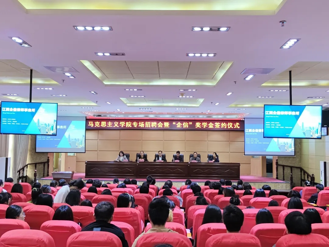 3月23日下午,马克思主义学院举办了江西企信律师事务所专场招聘会暨“企信”奖学金签约仪式。学校招就处处长、学校教育基金会主任黄春平出席会议,该院党政领导、全体法学师生参加。