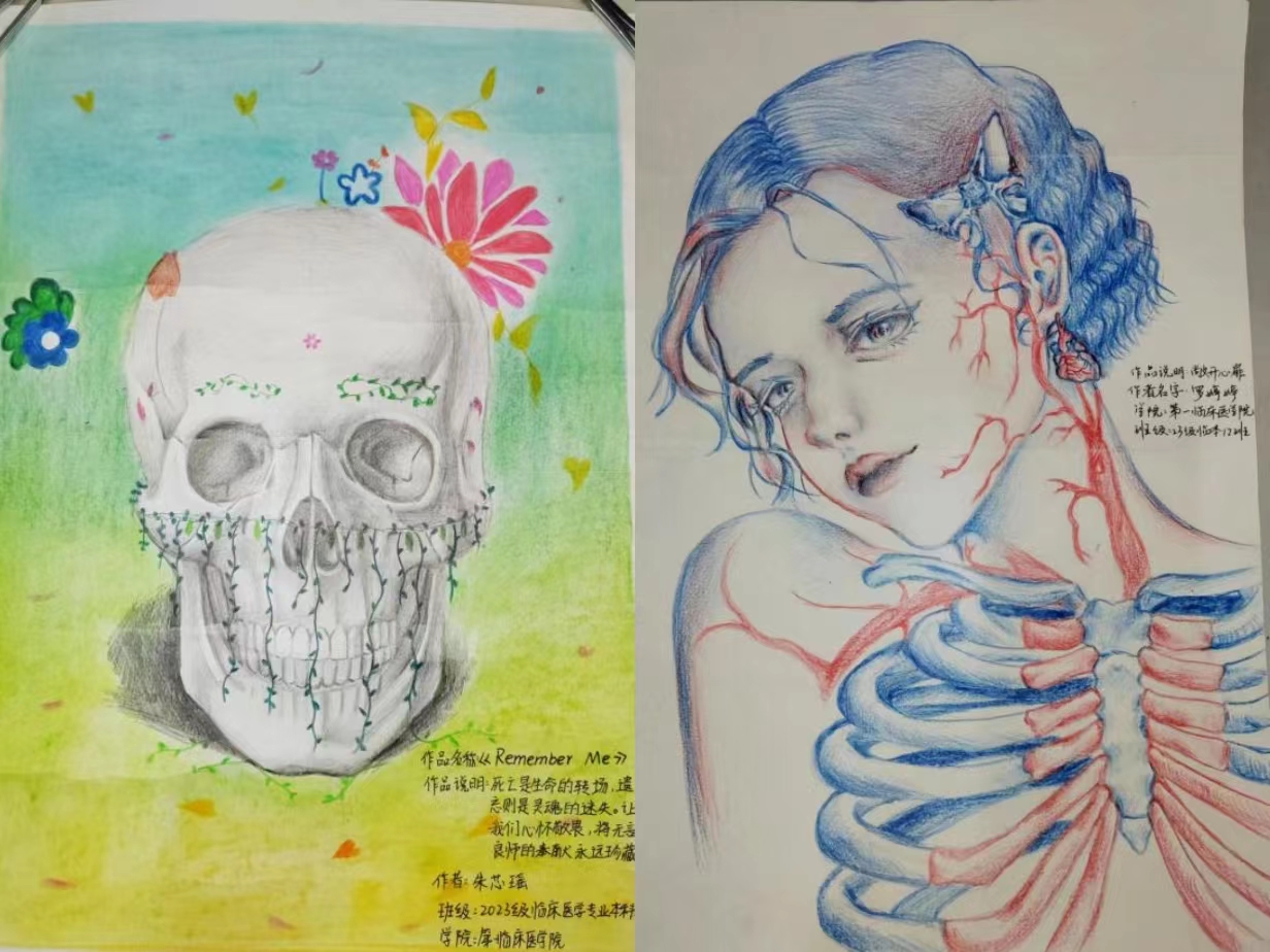 大赛共收到作品50余幅,经过人体解剖学教研室全体教师和我校解剖医学协会同学的评比,2023级临本2班朱芯瑶作品“Remember Me”获得一等奖,2022级临本5班周晓菲作品“人体宇宙”、2022级临床医学全科2班欧阳明珠作品“生命感触”、2023级口腔3班李睿卿作品“良师无言”获得二等奖,2023级临本7班龙永希、2023级临本12班罗婷婷、2023级口腔1班伍稚航、2023级临本13班李玫婷、2023级医学影像学2班杨梓艺等作品获三等奖。
