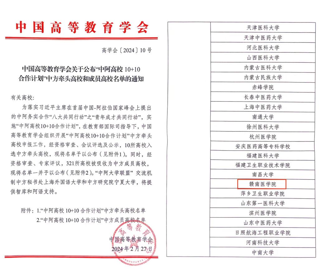 近日,中国高等教育学会发布了《关于公布“中阿高校10+10合作计划”中方牵头高校和成员高校名单的通知》,我校成功入选“卫生健康”领域中方成员高校,为进一步推动中阿教育交流与合作奠定基础。