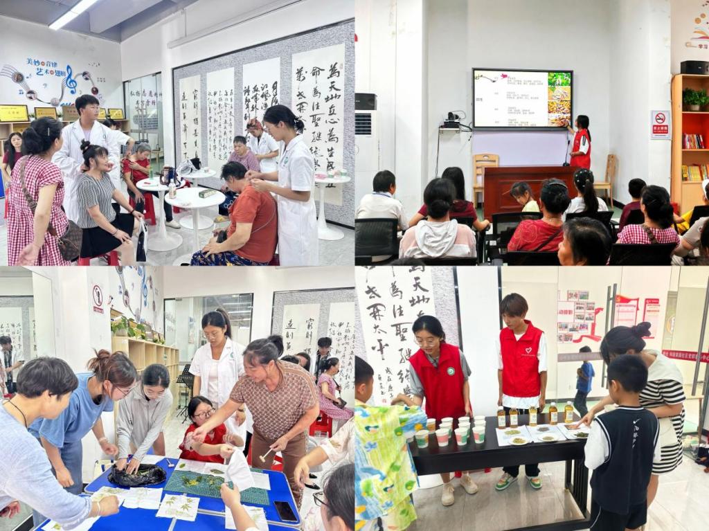 活动现场,志愿者结合所学专业知识,为居民提供健康咨询、血压测量、推拿艾灸、耳穴压豆等中医传统疗法服务,供应白刺香薷养生茶饮,发放香囊和中医药科普宣传册,开展中医药文化知识科普宣传。