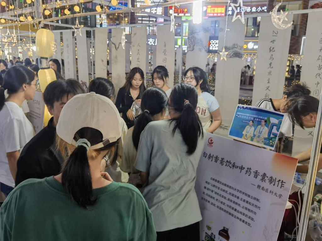 在社科普及文明集市区,药学院自制香囊和中药茶饮社科展位吸引了众多市民和高校学子驻足参观体验。“赣南医科大学药学院的活动很有意思,既有产品体验,又有中医药文化普及,有助于激发群众对中医药文化的热爱,希望还有机会能体验。”市民李女士表示。
