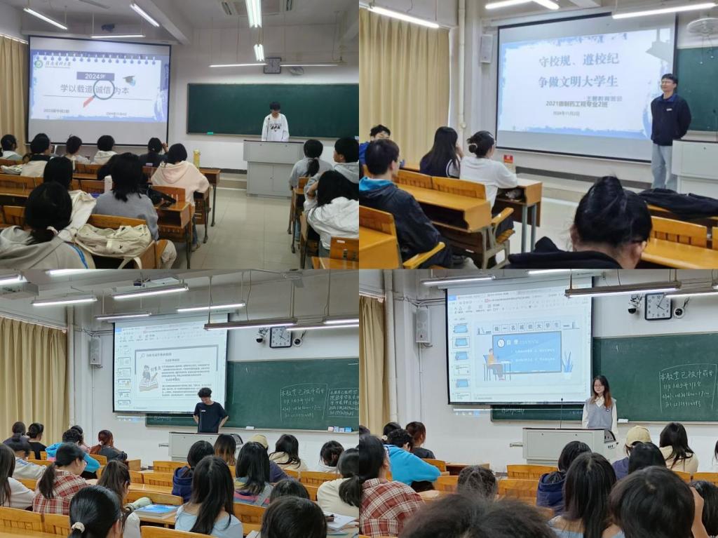 班会上,各班级带领同学们学习了《药学院进一步加强和改进本科生学风建设实施方案》,呼吁同学秉承“立德立行、求是求新”的校训精神,弘扬“文明、勤奋、求实、进取”的校风和“刻苦、严谨、求实、创新”的学风,从现在做起、从点滴做起、从自身做起,把学风建设融入日常学习生活,争做优良学风建设的宣传者和践行者。