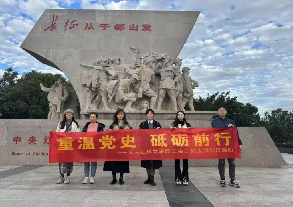 11月30日,人文社会科学学院教工第二党支部开展了以“重温党史 砥砺前行”为主题的党日活动,本次活动旨在增强党性修养,激发前行动力。全体党员前往革命老区于都,通过实地参观学习,深刻感受党的光辉历程和伟大精神。