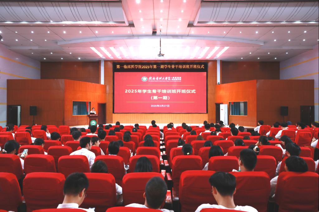3月27日晚,第一附属医院(第一临床医学院)2025年第一期学生骨干培训班开班仪式在黄金校区举行。第一附属医院党委委员、第一临床医学院党委副书记肖殿民,学生工作办公室全体辅导员,以及学生组织成员、班级干部代表等200余人出席活动。