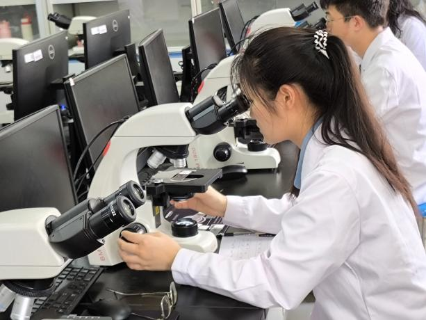 大赛组织严谨有序,经过各班级内部的选拔与推荐,最终共有来自各班的58位学生脱颖而出,齐聚决赛现场,同台竞技。决赛内容紧密围绕专业核心,聚焦显微镜的规范熟练操作与组织学切片的快速准确识别两大能力。赛场上,选手们凝神静气,熟练切换物镜,准调焦精,在镜下识别形态学特征,作出正确判断。
