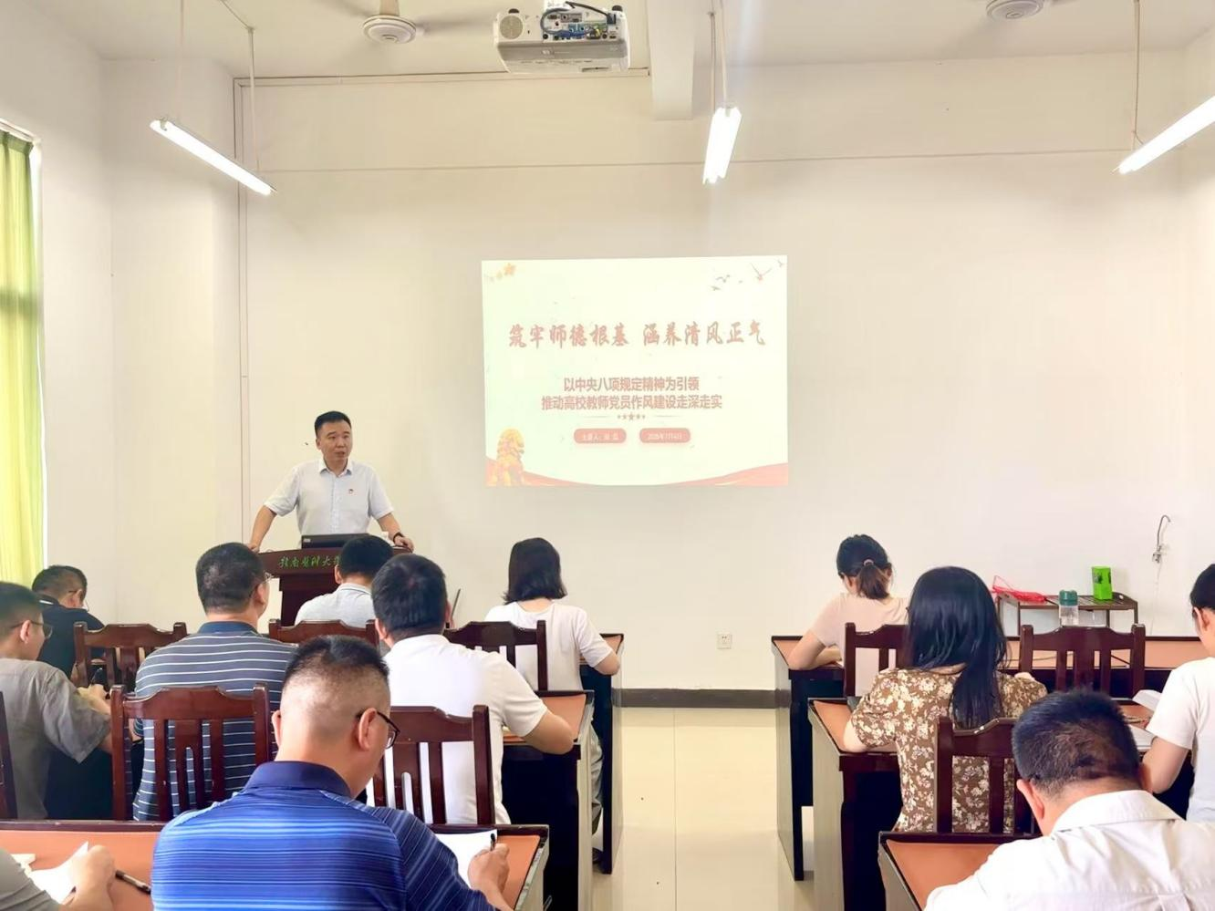彭磊从深刻把握中央八项规定精神核心内涵、深入查摆教师党员作风建设现存问题、推动中央八项规定精神融入育人实践三大维度展开,结合自身丰富工作经验,旁征博引、深入浅出地进行讲解。