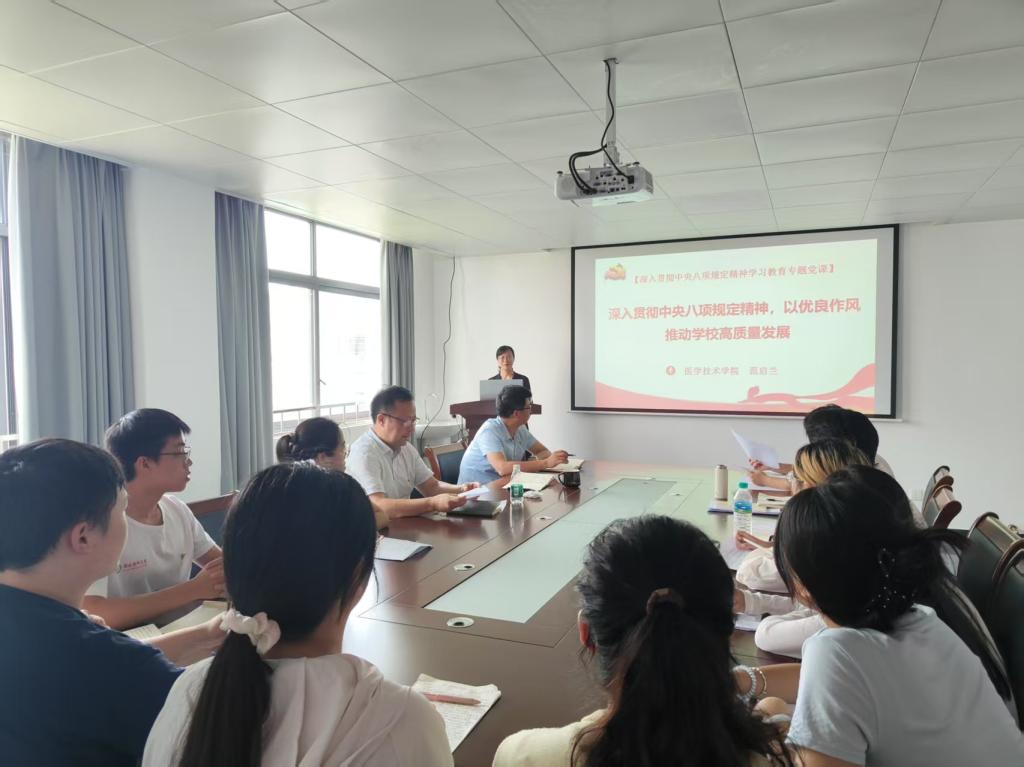 7月7日,医学技术学院党委书记范启兰讲授《深入贯彻中央八项规定精神,以优良作风推动学校高质量发展》专题党课,该院教工党支部、本科生第一党支部全体党员参加。