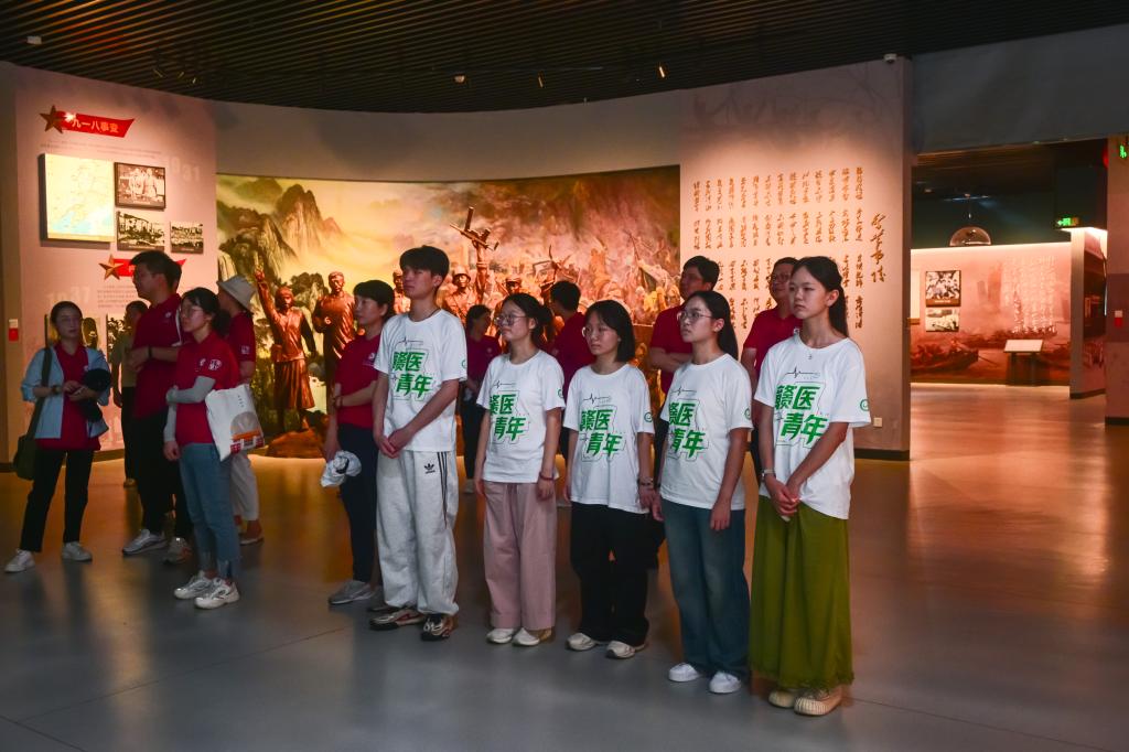 踏入红色诗词体验馆,新时代红医服务团的同学们紧跟讲解员的步伐,目光被一幅幅泛黄的手稿、一张张珍贵的照片深深吸引。从“红军不怕远征难,万水千山只等闲”的豪迈气魄,到“为有牺牲多壮志,敢教日月换新天”的壮志凌云,一句句浸润血与火的诗词,把大家带回那段烽火岁月。新时代红医服务团成员们一边认真聆听诗词背后的故事,一边在笔记本上工工整整地记录下感悟,时不时与身旁的复旦博士团成员低声交流心得。“这些诗词不仅是文学瑰宝,更是革命先辈们坚定理想、不屈信念的真实写照。作为医学生,我们要把这种精神传承到未来的医学事业中,在生命守护的道路上无畏艰险、勇担使命。”一位新时代红医服务团成员动情地说。