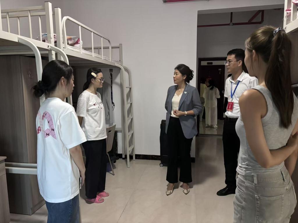 走访过程中,曾小英与正在收拾行李的同学亲切交谈,并仔细察看了宿舍各项基础设施、环境卫生、用电安全等情况,了解同学们的实际需求。交流过程中,曾小英围绕学业与生活给予指导,鼓励新生快速融入环境、营造优良寝室学风,以目标导向规划研究生生涯,并主动与导师、辅导员沟通解决问题。