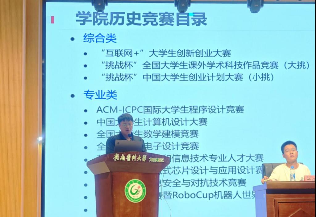该院青年教师、物联网工程专业2021届校友黄晴楠介绍了学院在学科竞赛中取得的丰硕成果,结合个人成长经历分享了以“以赛促学、以赛促长”的实践经验,详细介绍了竞赛方向与备赛路径,为新生搭建学业与能力提升的桥梁。2025级年级辅导员叶俊杰聚焦校园安全与校规校纪,通过校规解读、案例讲解,引导新生增强安全防范意识、严守校规校纪,为大学生活筑牢安全防线。