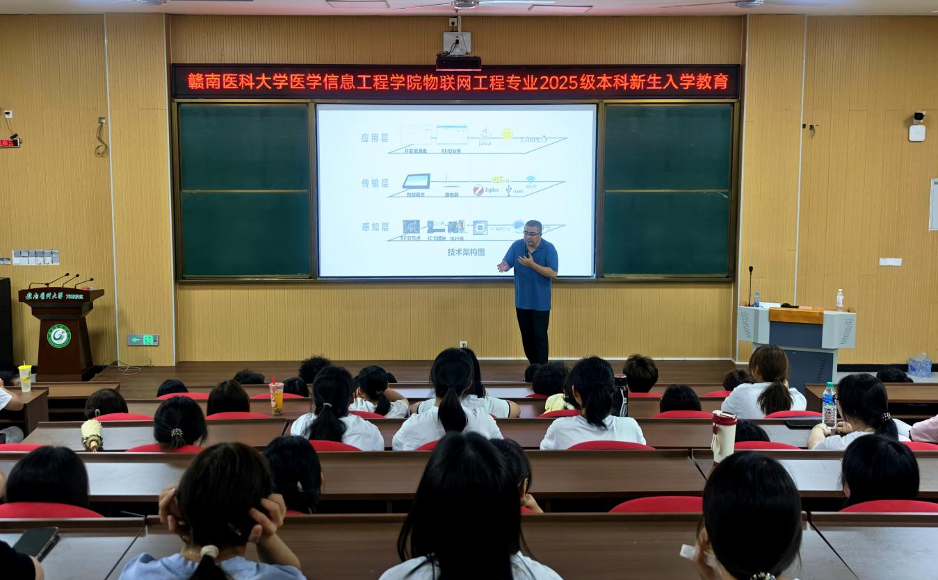 李晓鹏则围绕物联网工程专业“万物互联”的核心定位展开讲解。他结合智慧医疗设备互联、基层社区智能安防、农业物联网监测等与民生紧密相关的应用案例,同步介绍学院该专业的课程体系设计、物联网实验室硬件配置及校企合作实践项目。从当前行业“复合型人才紧缺”的市场需求,到专业“医工交叉”的特色发展方向,李晓鹏用具体数据与实例,让新生对“物联网如何服务医疗、赋能生活”有了直观认知,为后续专业学习搭建起清晰框架。