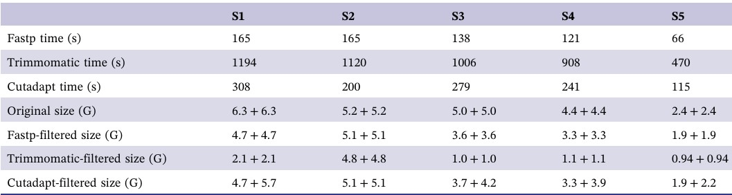 表2. fastp、Trimmomatic 和 Cutadapt 的速度评估
