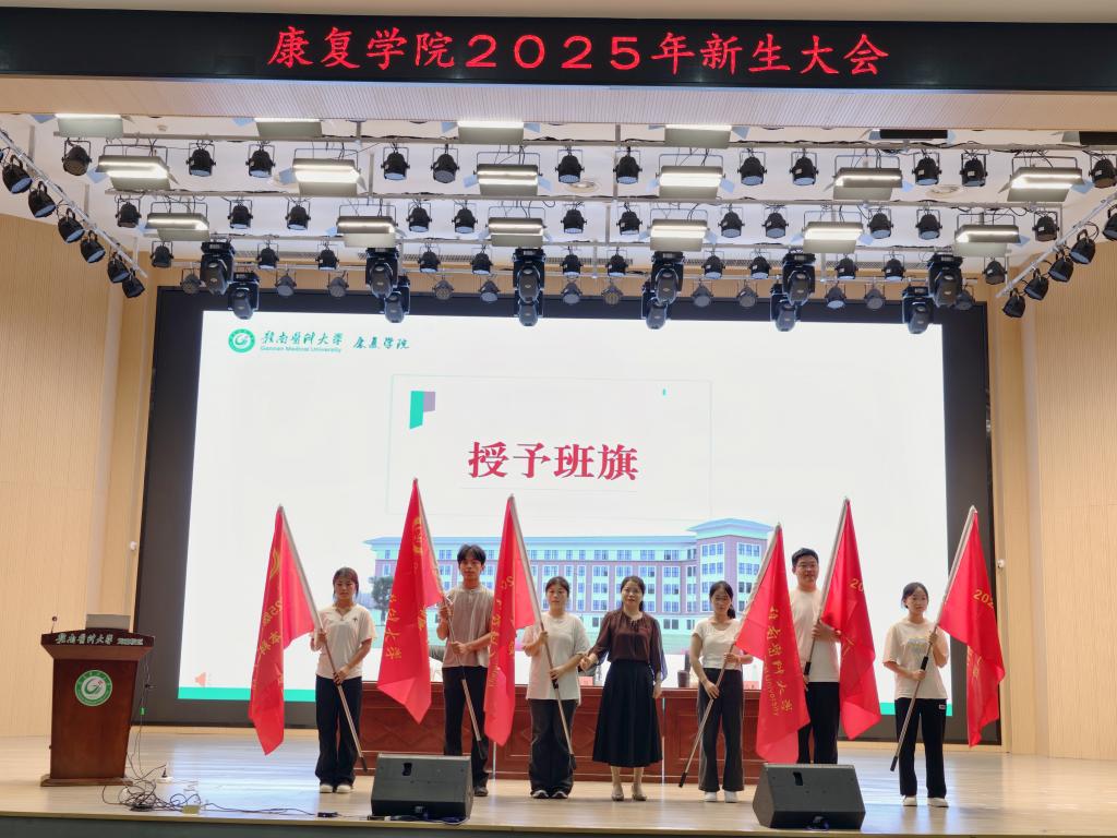 叶贞丽为2025级新生班级代表授予班旗,李伟为新生班主任颁发聘书。