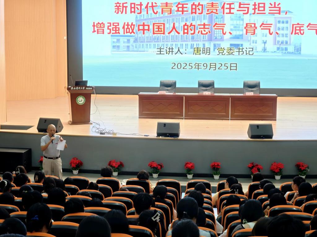 9月25日晚,医学信息工程学院党委书记唐明以《新时代青年的责任与担当——增强做中国人的志气、骨气、底气》为题,在龙南校区为该院2025级本科新生讲授开学“思政第一课”。该院学工办辅导员、新生班主任与全体新生齐聚一堂,在思想碰撞中明晰青年责任,在精神引领下锚定成长方向。