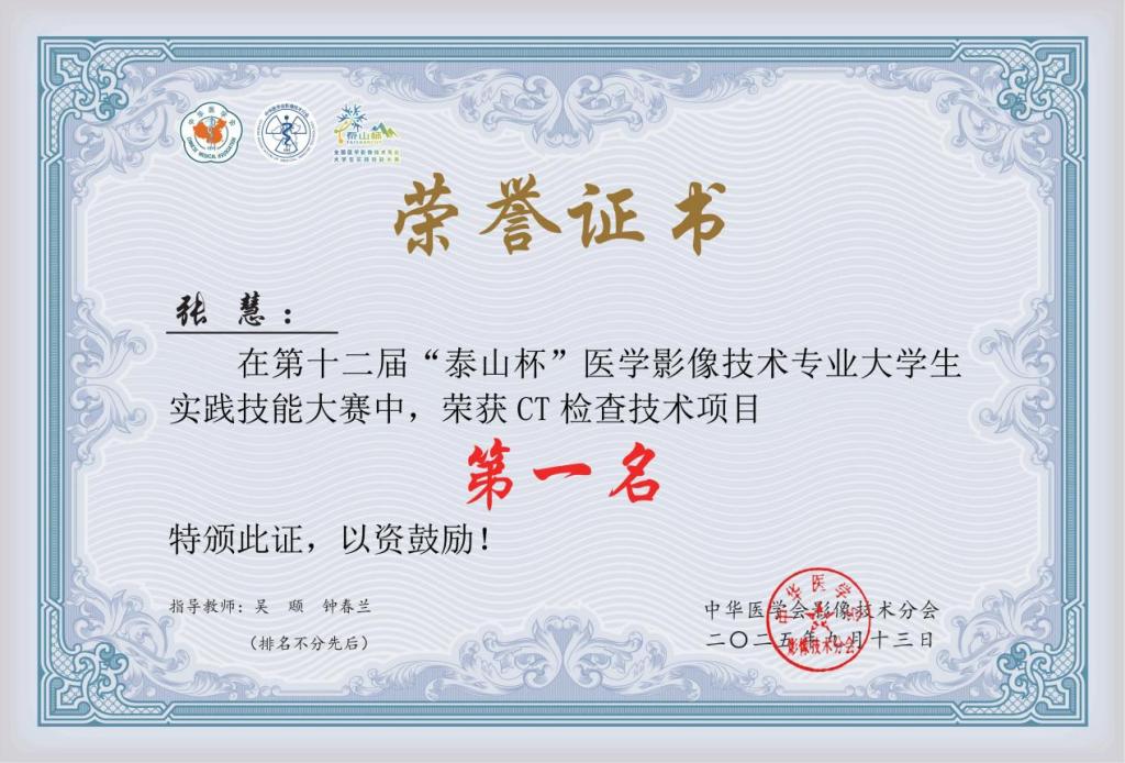 近日,2025年第十二届“泰山杯”全国医学影像技术专业(本科)大学生实践技能大赛在山东淄博落下帷幕。我校医学技术学院师生在此次比赛中斩获一等奖1项,二等奖3项,三等奖2项,赣南医科大学荣获团体赛二等奖。其中,张慧荣获CT检查技术单项一等奖、罗诗意荣获医学影像诊断单项二等奖、胡宇擎荣获MR检查技术单项二等奖、廖雨霏荣获DR检查技术单项三等奖,毕效云老师荣获本科教学比赛三等奖,吴颋、钟春兰荣获CT检查项目优秀指导教师。