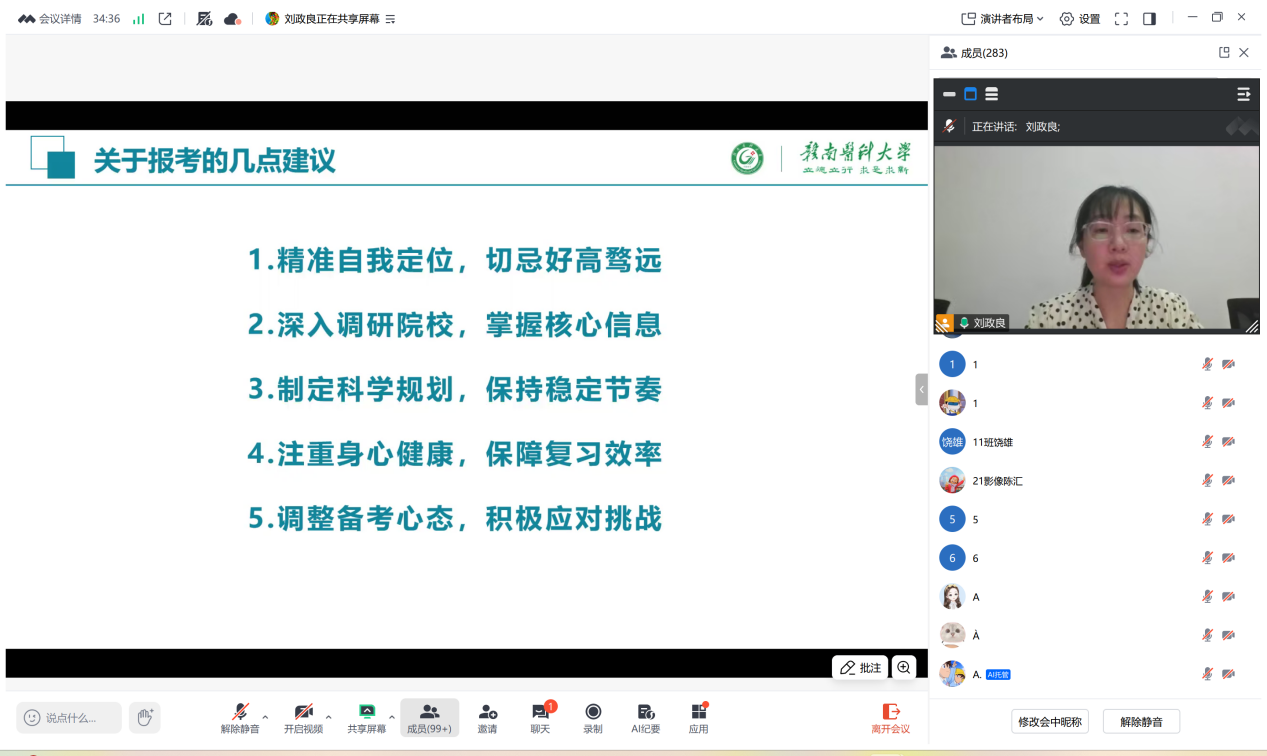 为进一步引导我校2026届毕业生了解考研形势,明晰择校报考要求,助力考研学子成功“上岸”,9月28日,研究生工作处联合第一临床医学院举办考研报考指导交流会。研究生工作处副处长曹思、招生办公室刘政良担任主讲,2026届300余名毕业生、家长通过线上方式参与。