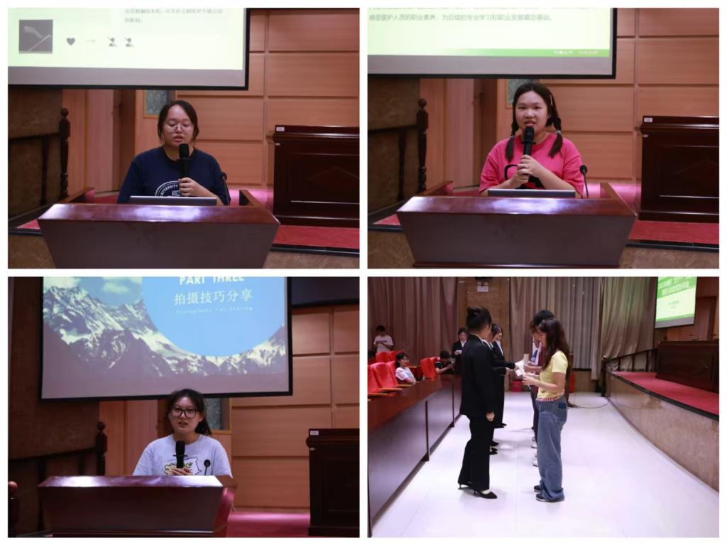 在分享环节,邱芷怡同学从韩丽珠作品《缝身》出发,以文学的视角探问个体灵魂的完整与医者精神的联结,引发大家对自我与职业身份的深层思考;颜禧同学结合临床见习经历,动情讲述对“医者责任”的理解,呼吁同学们“把每一个知识点学扎实,未来才能托起每一个生命的重量”;钟守伟同学深入乡村开展健康调研,用脚步丈量基层医疗现状,展现了青年医学生扎根大地、服务群众的仁心担当;万杨乐同学则通过摄影作品《四姑娘山无言》,以镜头语言捕捉自然的壮美与生命的宁静,鼓励大家在自然中汲取前行的力量与内心的温度。