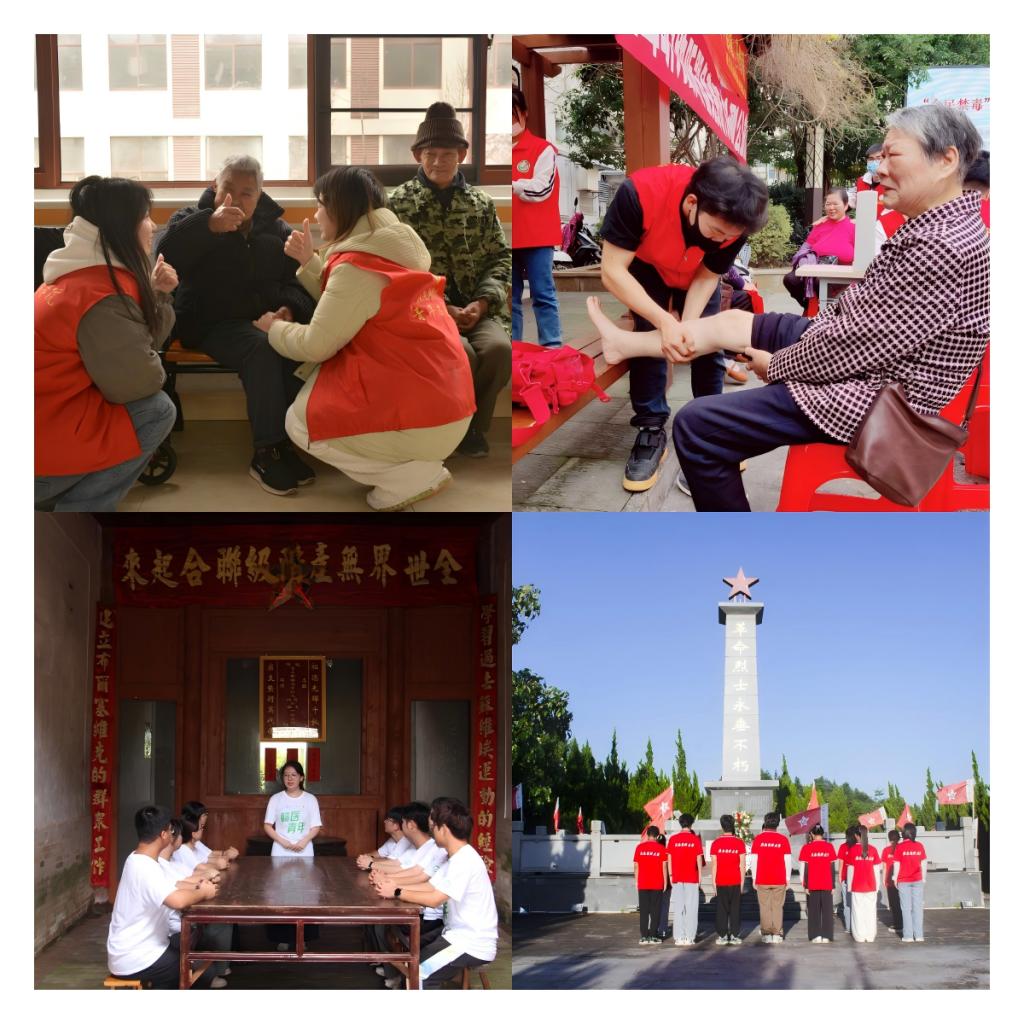紧扣“医我看”中“医之魂”的核心,康复学院将红医文化这本厚重而鲜活的思政教材,无缝融入育人全链条。仅2024年,学院就精心策划了“牢记嘱托强国有我 行走赣鄱感恩奋进”大思政实践活动、党的知识竞赛等10余场主题活动,吸引400多名青年学子踊跃参与,沉浸其中。走进学校红色卫生史博物馆,泛黄的旧照片、斑驳的医疗器械静静陈列,无声讲述着革命年代白衣战士们“政治坚定、技术优良、无私奉献、救死扶伤、艰苦奋斗、勇于开创”的如磐初心。这场时空对话让同学们灵魂深受洗礼。“红医有我”志愿服务队则将信念化为行动,从社区便民义诊到特殊儿童康复中心,从专业的推拿理疗到耐心的儿童足脊健康筛查,学生党员和入党积极分子的身影如星火遍布。全年累计输出15500余小时的志愿服务,红色理论宣讲声入人心,专业技能服务情暖万家,红医精神在躬身实践中落地生根,枝繁叶茂。线上阵地同样精彩纷呈、活力四射。“红医故事青年说”、“红色故事大家讲”微信专栏,以青春语态讲述红色经典 ,累计阅读量突破1.5万次 ;“青年大学习”覆盖率持续稳居95%以上 ,成功构建起“线下实践有深度 + 线上传播有广度”的红医文化育人立体生态。