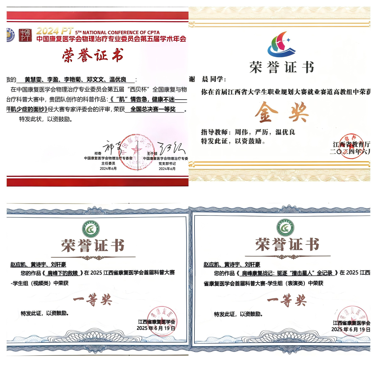2023 级硕士研究生谢晨既是榜样也是纽带——她不仅斩获全国首届职业规划大赛铜奖、研究生国家奖学金,还牵头成立“考研互助小组”,帮助同学明确复习方向;2021 级康复物理治疗专业黄慧雯获国家奖学金后,主动开设“专业学习工坊”,分享全国康复物理治疗科普大赛一等奖第一名的备赛经验。学院创新推行的“2+2”创新型人才培养模式,为94名入选学生均配备党员导师,在临床实践、专业竞赛中全程护航,2024年该批学生在全国康复物理治疗科普大赛、江西省康复医学会科普大赛等赛事中斩获省级以上奖项5项,专业能力显著提升。