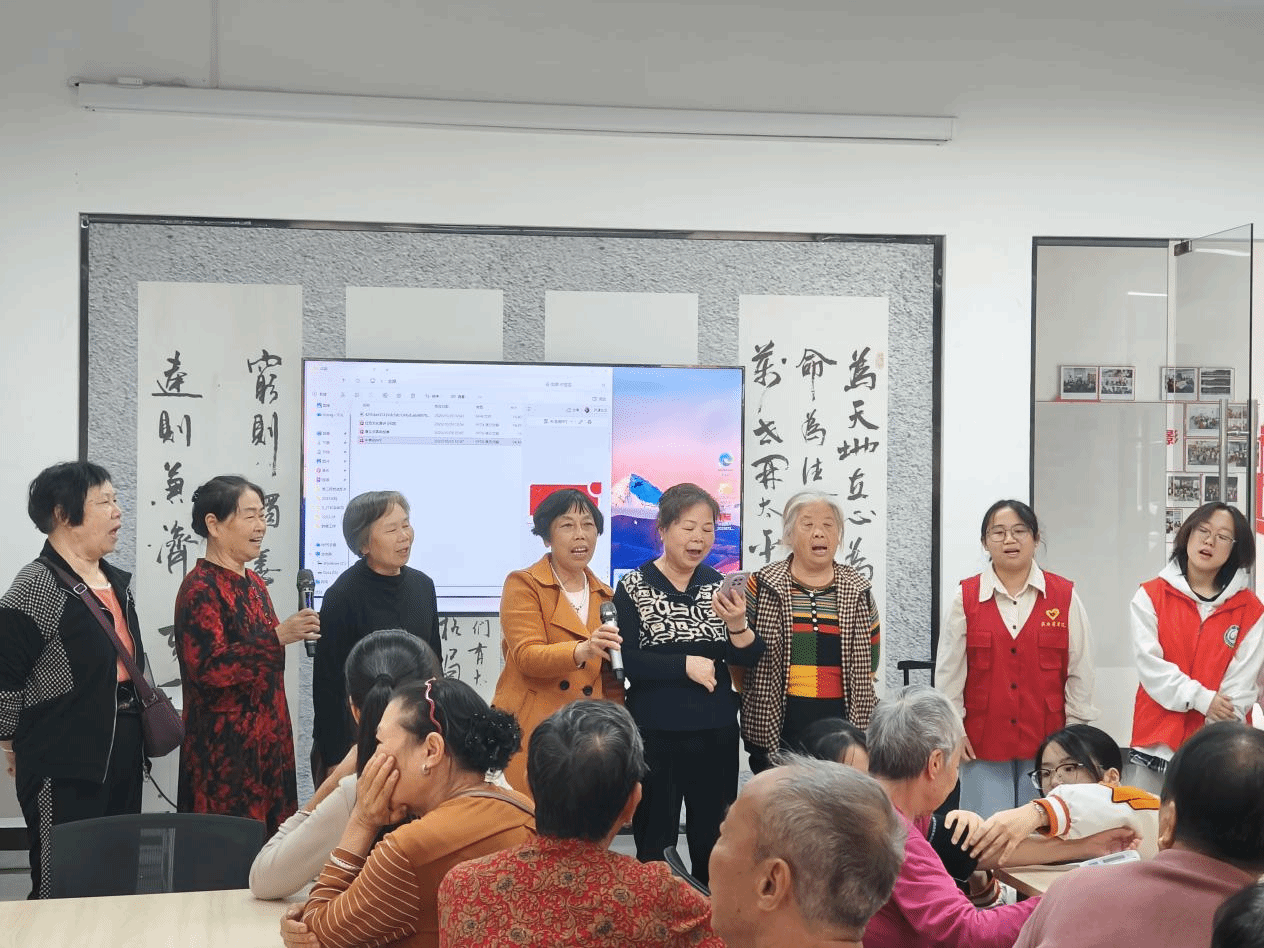 活动现场歌声飘扬,志愿者与银龄长辈并肩而立,共同唱响《我和我的祖国》《映山红》等经典曲目。熟悉的旋律响起,每一颗炽热的赤子之心同频共振。长辈们还主动亮出“绝活儿”,那些带着历史印记的歌词从他们口中缓缓流出,让红色记忆在歌声中鲜活起来。